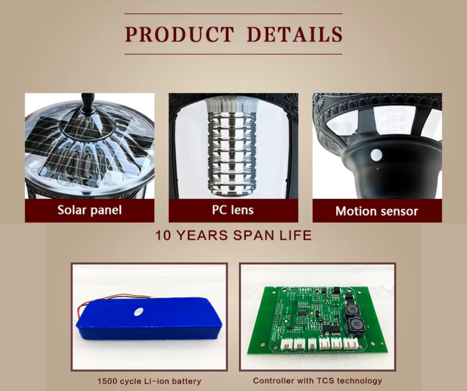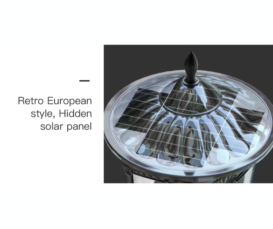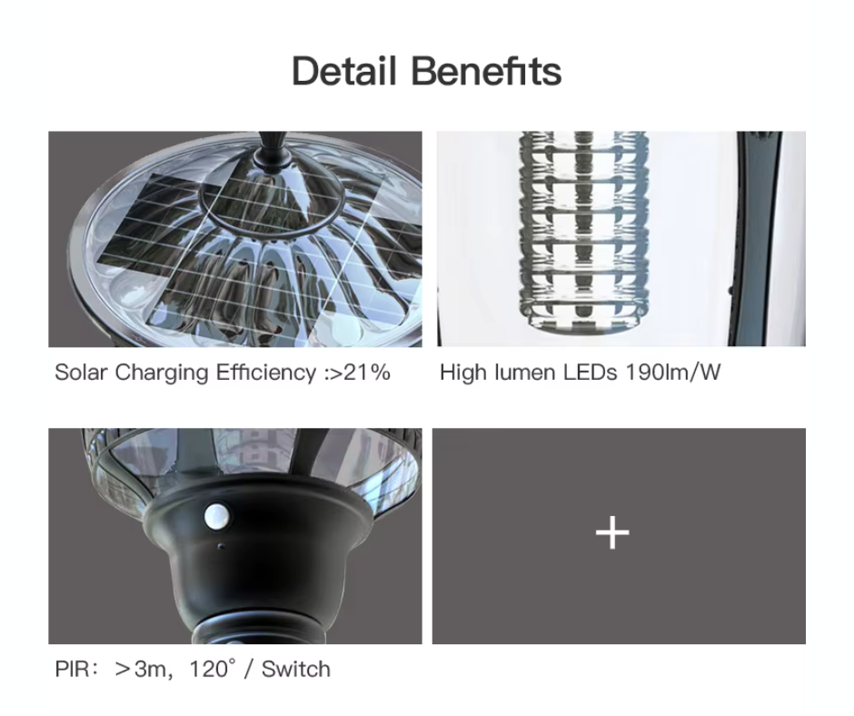 Technologie solaire intelligente : panneau monocristallin discret, batterie Li-ion intégrée, fonctionnement automatique du crépuscule à l'aube.