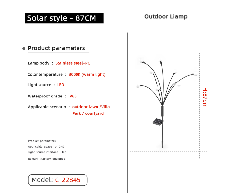 Inspired by nature and designed to enhance your outdoor spaces, the C-22845 solar light combines a sleek design, efficient LED technology, and durable materials to create a warm and elegant atmosphere.